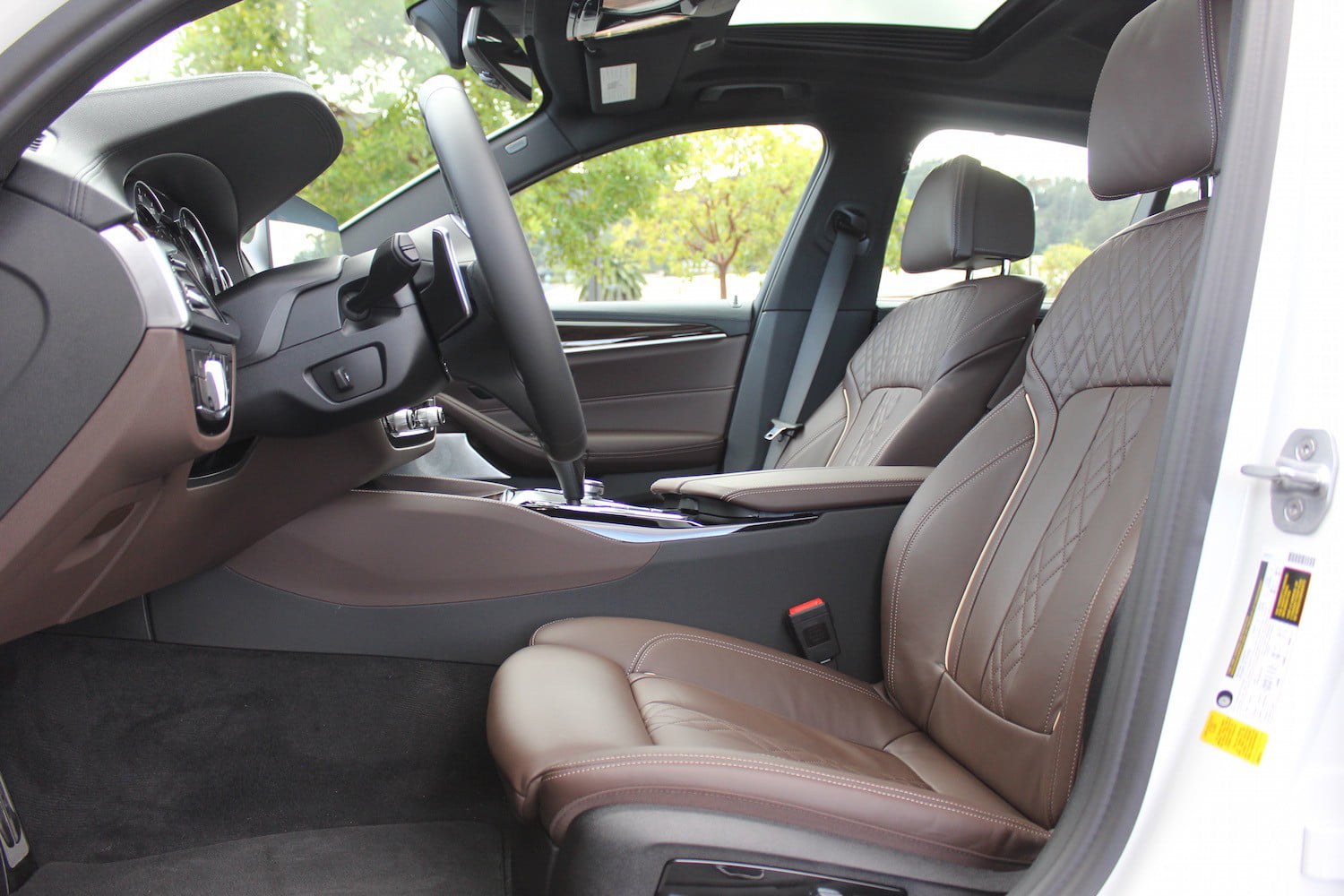 BMW再次查看其7系列,用于整个新的5个舱内设计灵感。正如我们从汽车制造商那里所期望的那样,简约的造型沟通奢侈品远远超过炫目的铬或流动的形状。沿仪表板和中心堆的木头和金属交织在一起。可用的Mocha Napa皮革内饰,白色管道精美地对比木头,并为另一种定量的舱室添加了迷人。