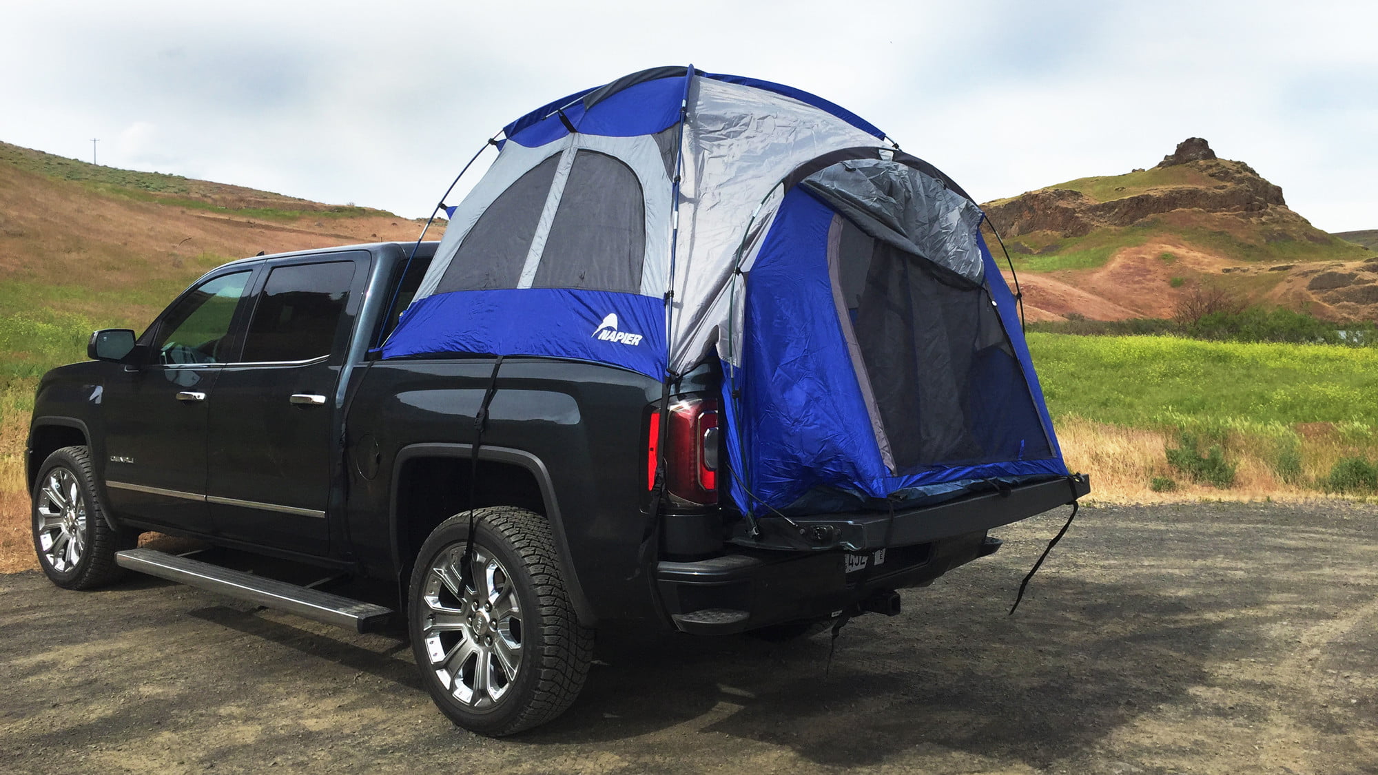 使事情更容易,连同上述2017年德纳里峰山脉双排座驾驶室(而420马力的6.2升v - 8 VVT发动机,四轮驱动,和坐在22英寸的车轮),GMC是足以包含一个巧妙的露营配件与一辆皮卡,任何人都应该看看投资,轮渡帐篷(搜索一部分# 19329816)。这个帐篷只花了两个人不到五分钟的时间就组装好了,它毫不费力地经受住了我们在华盛顿高沙漠那晚经历的大风。此外,塞拉号的驾驶室足够大,如果天气不好的话,可以容得下两个人睡在里面,而帐篷则足够大,可以容得下一张大号气垫(卡车驾驶室里的辅助电源插座很方便地打了气)、两个人和几个背包。