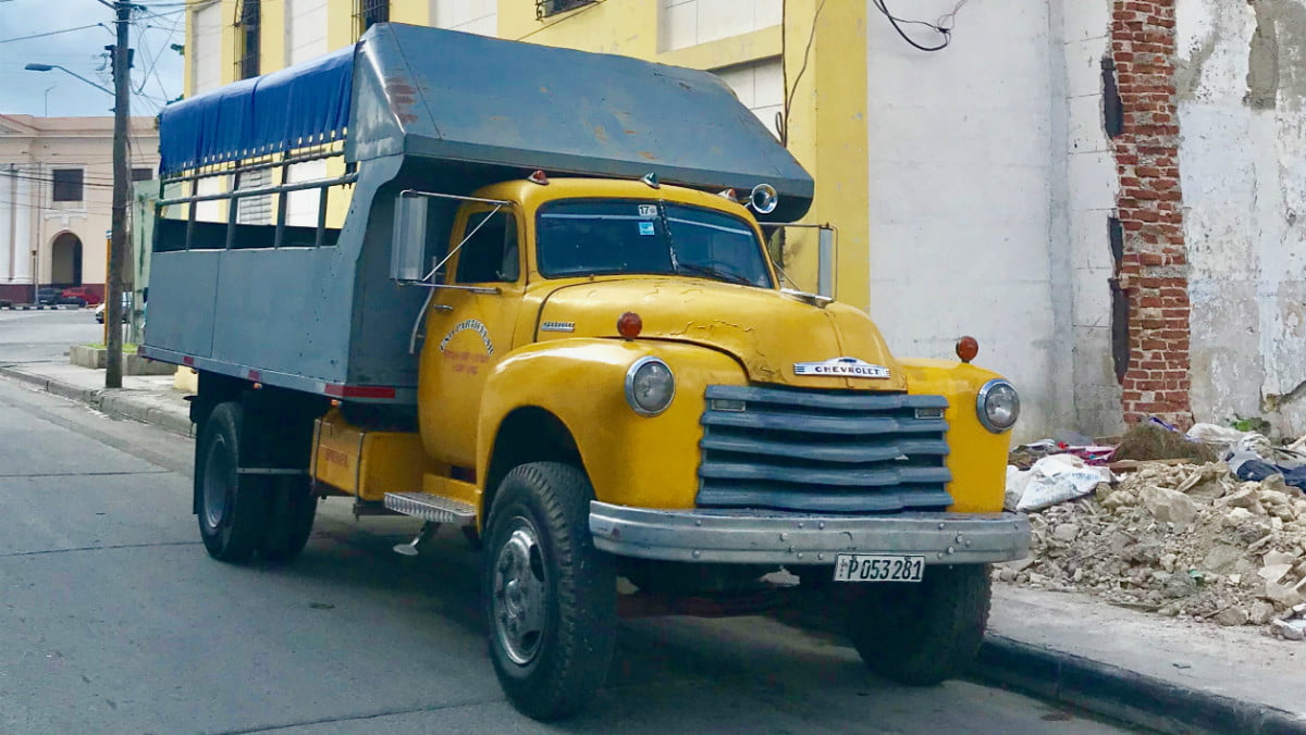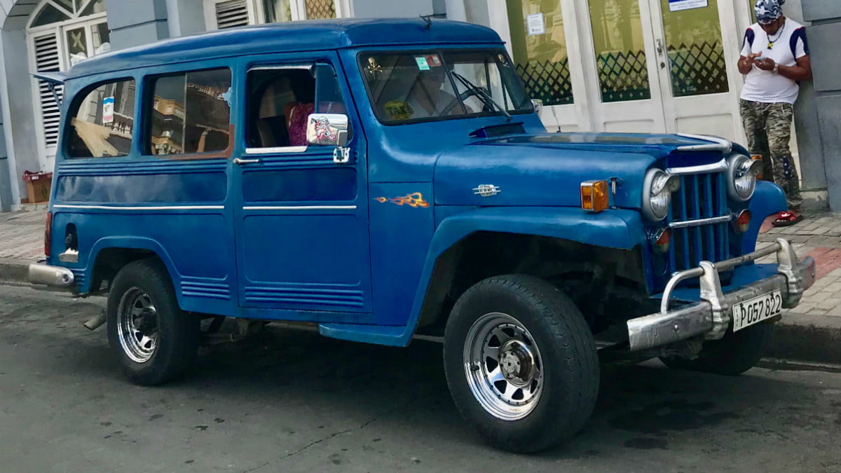 古巴公共交通难以进入古巴,许多创造性当地人将卡车转变为裸骨,骨头嘎嘎作人,人们移动的机器(左上角)。但是,其他出租车夸耀了更多可识别的机构。看看吉普车上的小火焰(右上角)。