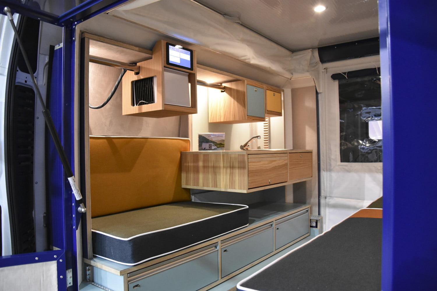 PlugVan是一个6。5英尺的立方体,可以滑进大多数货车的后部。安装是手动完成的帮助四个可伸缩的腿,帮助引导它到位。一旦单元被固定,墙壁和屋顶就会膨胀到一英尺,以确保即使是最宽、最高的货车也能舒适地装入。该模块在一个紧凑的空间中包含了大量功能,包括厨房区、可转换的床/休息室/餐厅、气候控制功能、多区域照明,以及可选的智能家居功能,这些功能都可以通过触摸屏控制来监控车载电子设备。因为这个模块不会占据货车后部的全部货物空间,它留下了足够的空间来装你所有的户外探险装备在前排座位后面。