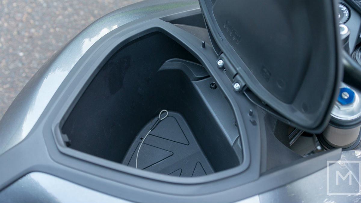 DSR上的一个假“油箱”隐藏了一个非常方便的存储空间,虽然太小了,装不下头盔,但可以装充电器、折叠雨具、第二套手套、一个高筒能量饮料罐(或两个)、一个三明治(或两个),还有几个糖果能量棒,一部电话,以及其他一些零配件。如果你选择最大的电池,你就失去了这个非常方便的存储空间,所以我们说,省下你的钱,把垃圾箱留着吧。