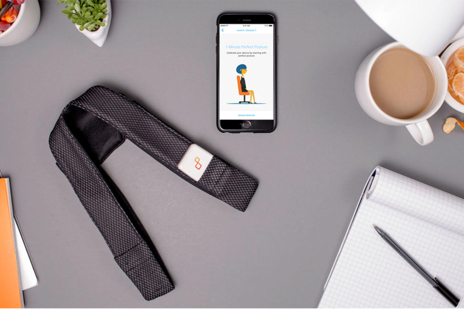 你首先下载它的(免费)应用程序,然后用USB数据线为这个小矩形设备供电。然后你戴上支架5分钟,在此期间你要保持理想的良好姿势,教会设备识别对你来说什么是理想的姿势。