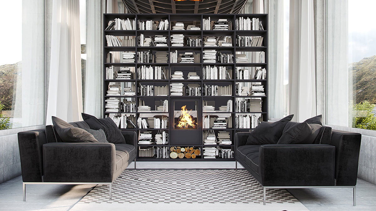 室内设计是现代的和奇妙的微妙,与冷灰度色调强调的观点。客厅里有一个高耸的深色书柜,作为座位空间和厨房之间的分隔。