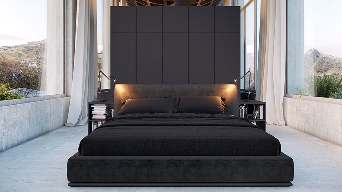住宅的中心是浴室,其外墙形成了一个大的黑色立方体,为住宅的极简主义美学增添了令人惊讶和迷人的口音。整个房子的中央墙壁和风化的混凝土瓷砖创造了一个开放流动的室内布局,最终形成了一间被五彩缤纷的夜空包围的单色卧室。