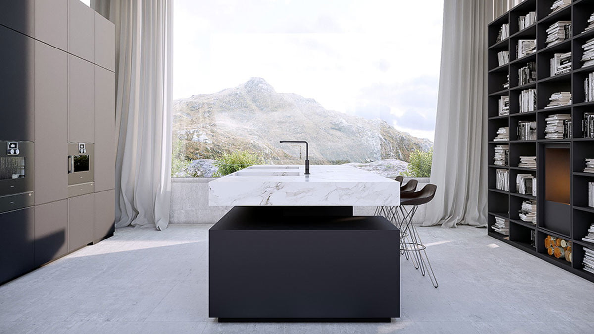 在厨房里,明亮的白色大理石台面与醒目的深色岛台和各种电器相衬,强调了看似无形的屏障与远处的山脉之间的距离。