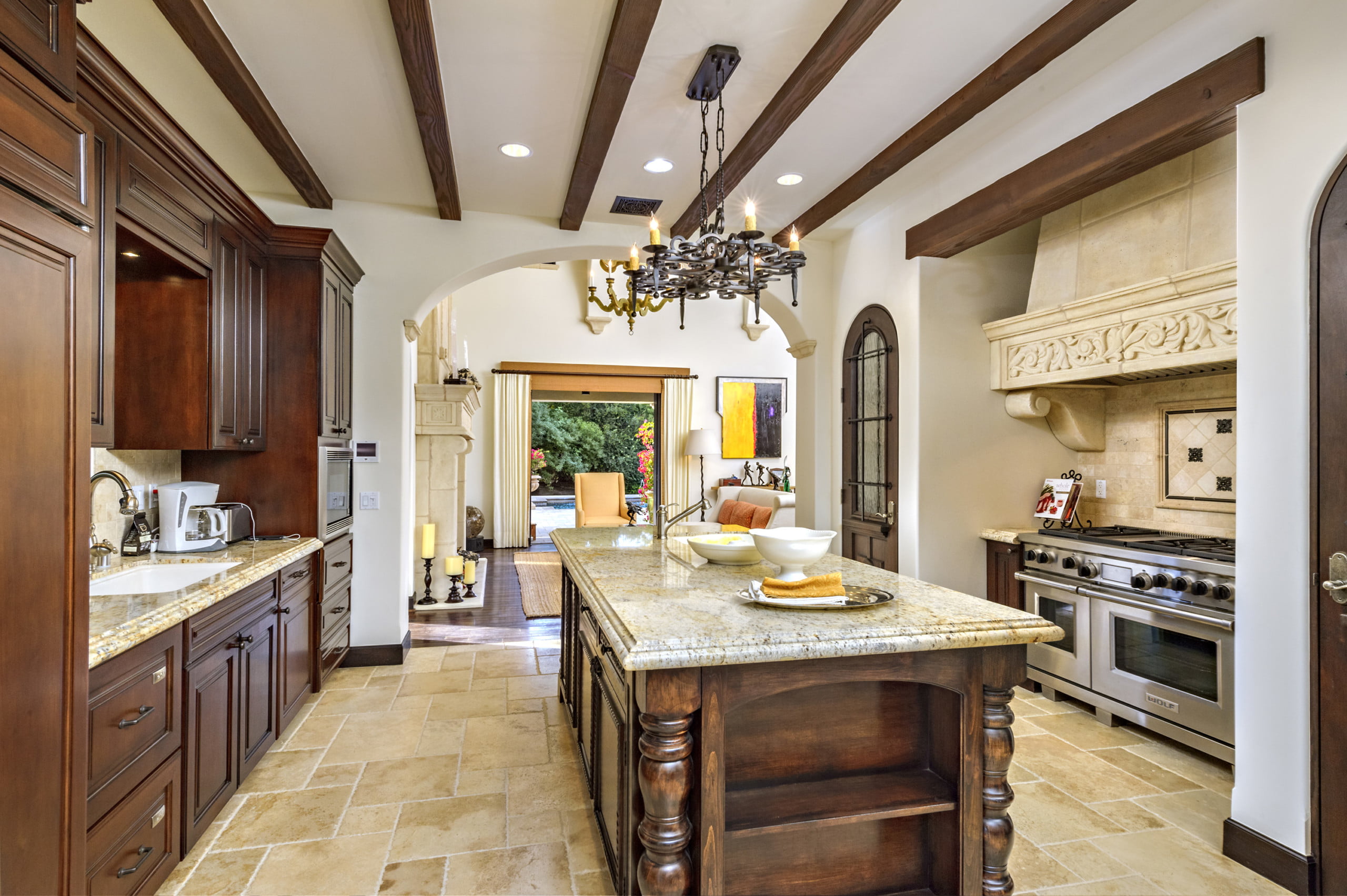 里面,经典的意大利氛围仍在继续。深棕色的暴露木天花板横梁在入口和厨房的米色石瓷砖地板平衡。起居室和用餐室配备了木板地板,配合双高度天花板上的暴露梁。白墙让已经大的房间感觉更宽敞。在整个空间中,旧世界意大利口音可以被发现,如复古风格的吊灯,雕刻檐口,为餐厅的天花板梁,锻铁楼梯栏杆。
