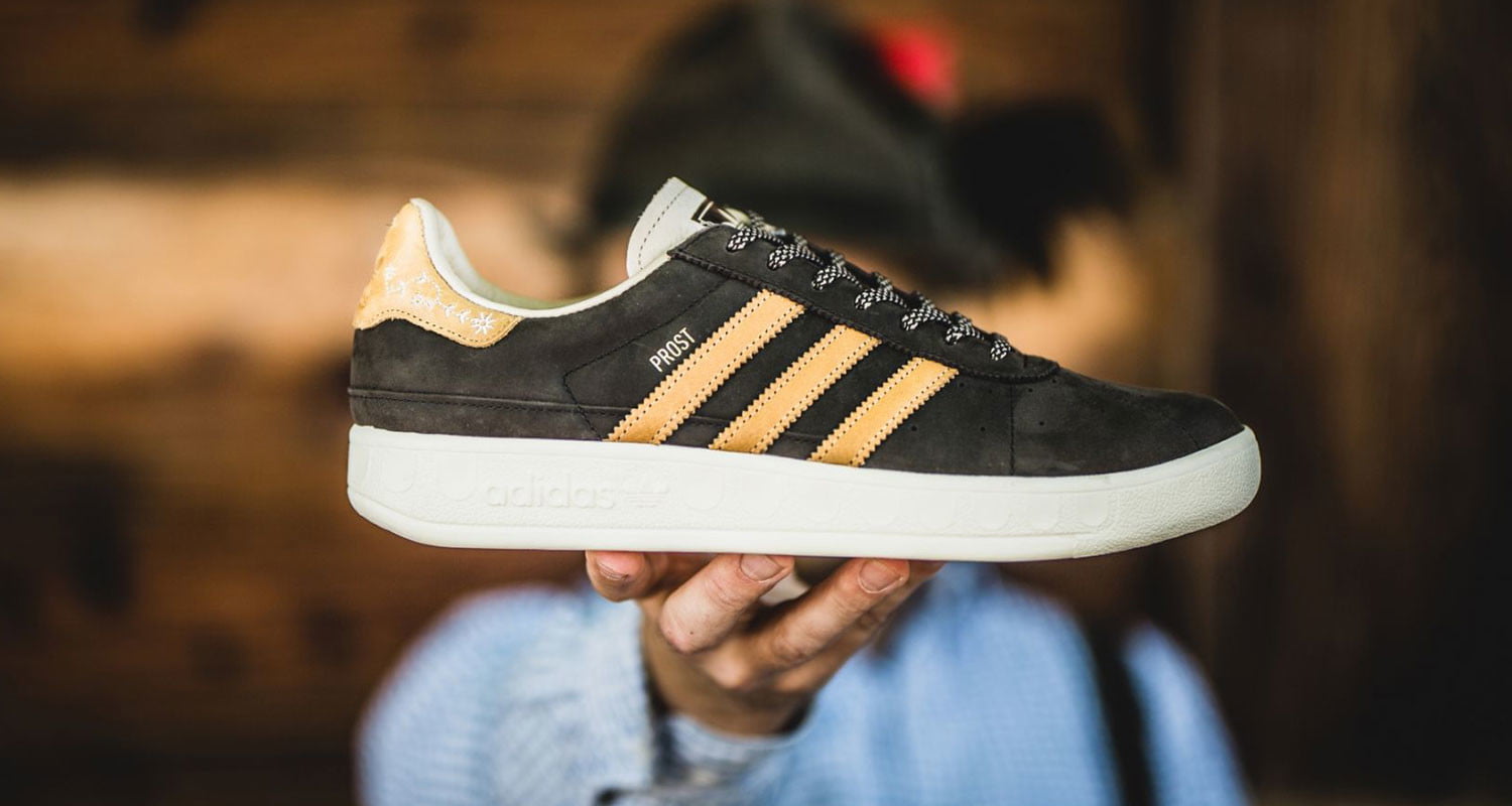 这双鞋以浓郁的巧克力和金色为特色,系有花边,标志性的三条纹上方有“Prost”(德语“Cheers”的意思),与德国慕尼黑啤酒节的传统服饰紧身连衣裙和皮短裤完美搭配。简单地说,这些应该是你喝啤酒的首选。