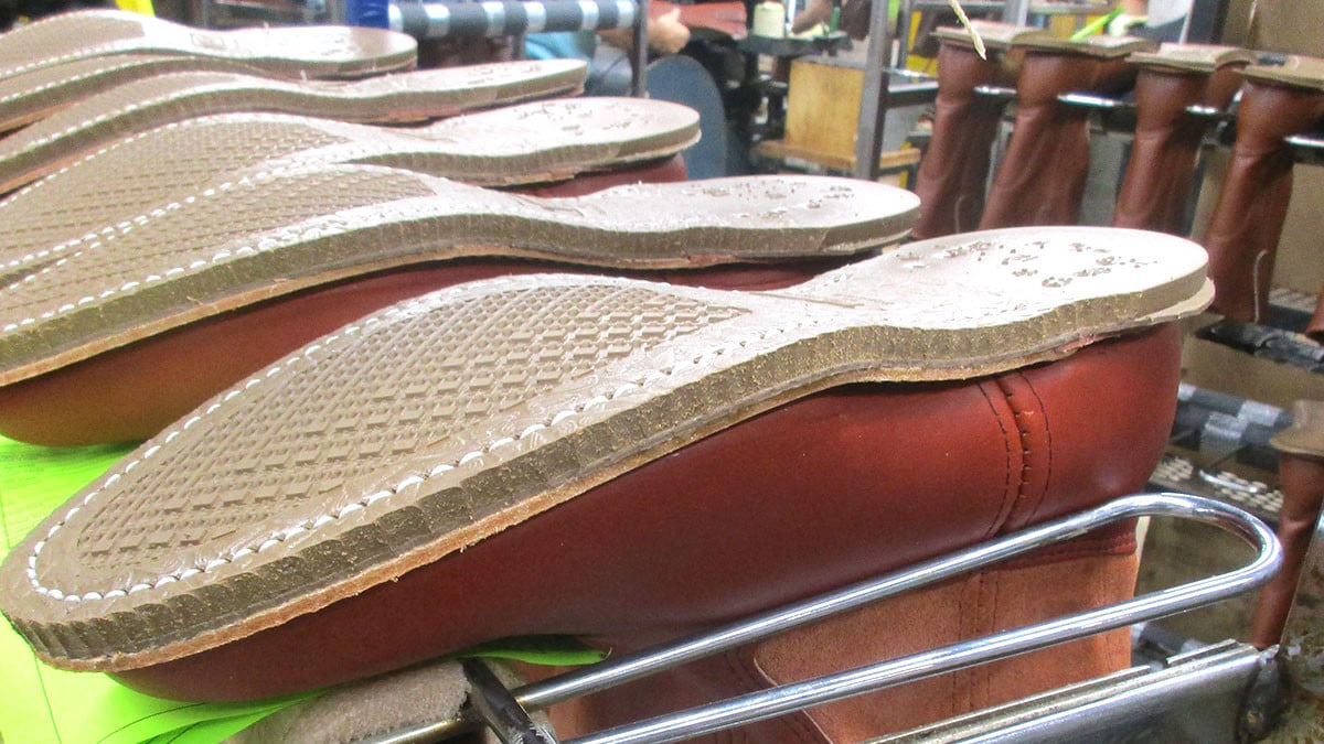 一旦物质被测量和切割,框架就会缝制在“最后”围绕“最后”,这是鞋跟和其他必需部件固定的特定鞋的塑料模型。一旦鞋子塑造,它就会从最后取出并进入安装外部鞋底的转盘,并放置剩余的针脚。