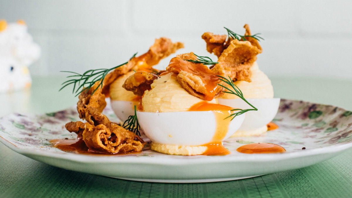 由梅森·赫里福德创建,他是祝你有个好胃口的2017年度最佳新餐厅,土耳其和狼在新奥尔良,这些魔鬼蛋是卡津人对经典的重复。加入适量的香料炸鸡皮,你可以在一个小点心大小的地方,享受到世界上最好的东西。