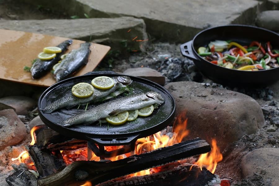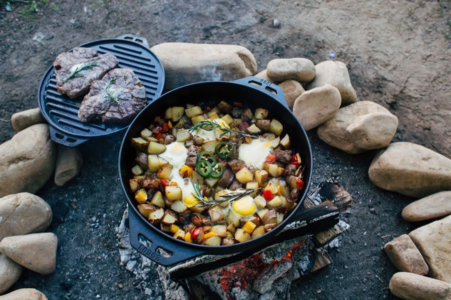 虽然“万事俱备”很有用,但我们绝对建议在只需要短途徒步前往露营地的旅行中带上它,而不是拖着它到处走。但规模确实有其好处;14英寸的锅盖可以烤出大量的肉,这锅能装6.8夸脱的食物。把一些刚抓的鱼放在烤架上,或者做一些足够喂饱大家的辣椒!