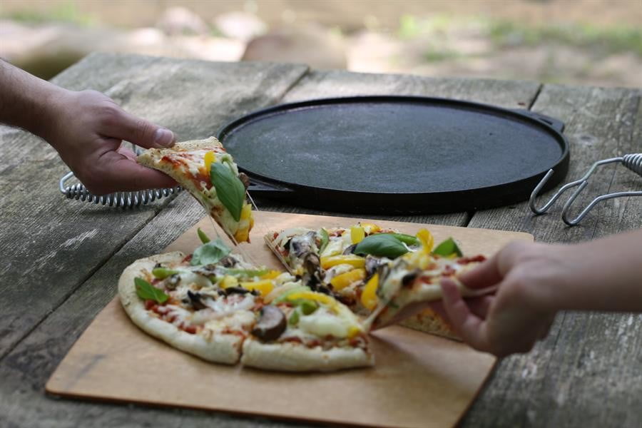 29磅重的“全厨”绝对不轻,但两块就能做出五种不同的烹饪方式。有一种带有盖子的炒锅可以做荷兰烤箱,盖子本身可以做煎锅和烤架。你也可以把锅盖翻过来——这很适合做披萨——然后把木炭放在锅盖上,这样可以均匀烘烤。