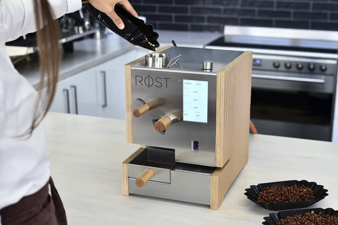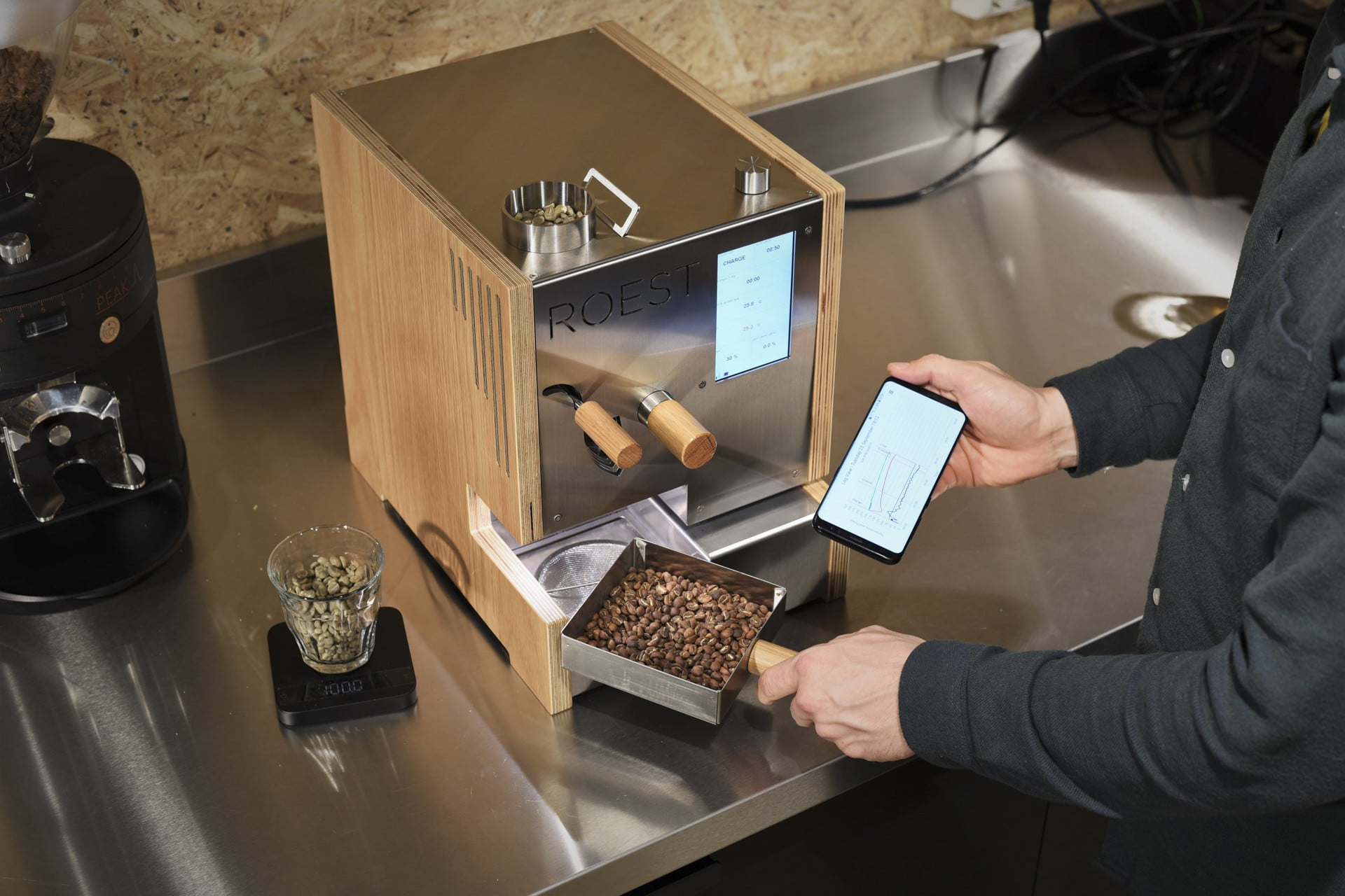 Roest的烘焙室用固定滚筒和双风扇进行专利,用于背靠背烘烤。机器是关于a的大小家用咖啡机并适合你的柜台。但最好的部分?Roest拥有一个带有单个排气系统的内置通风系统,可无烟体验。
