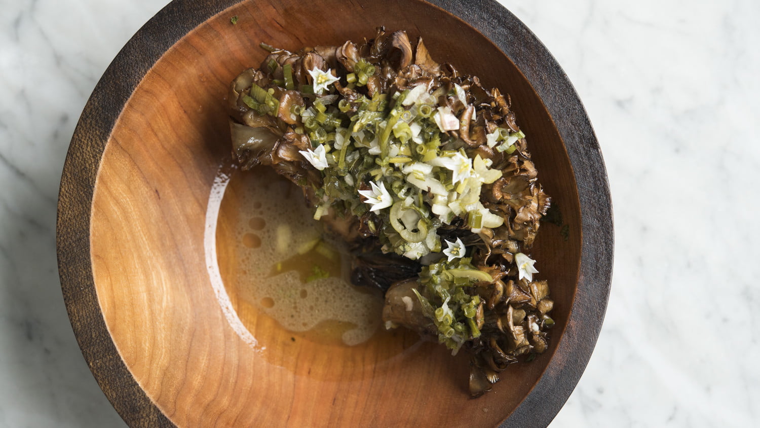 JY:这道菜是为了表达发酵或陈年食品随着时间的推移慢慢发酵的味道。我们把猪肉放了大约三个月清酒李和我们的盐曲腌料。我们把它简单地用平底锅烤了一下,加上一团第戎榛子和加热的半酸切莴苣。