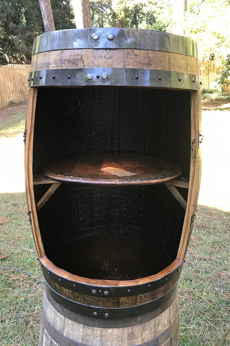 这座桶是为酒的制造而建造的,所以它可能坚持其主要目的。坐在头上的桶绕着腰部,使其成为娱乐的良好高度。至少将顶部桶头保持在桌面上,您可以在其中混合或倾注饮料。删除Staves以在内部(非常适合存放瓶子或玻璃器皿)上的各种分类的特区,并利用箍作为您最喜欢的酒吧毛巾的机架。