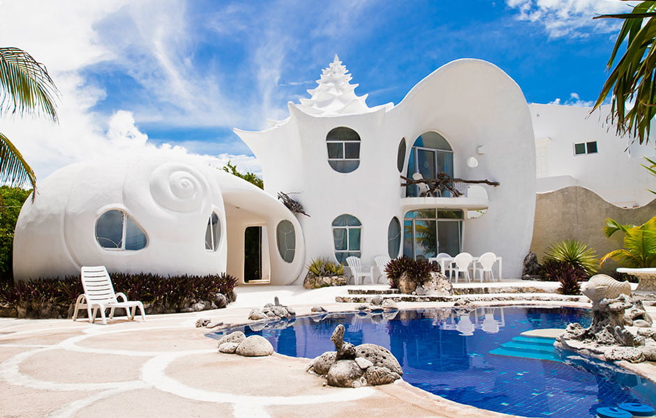 这地方太棒了。由建筑师Eduardo Ocampo建造,贝壳屋提供了一个非常独特的休息站,可以舒适地睡四个人。除了其独特的设计,这座小房子承诺将是一个梦幻般的住宿,有大量的隐私-除了路过的游客热衷于拍摄古怪的外观-和凉爽的因素,感谢私人游泳池和休息区。