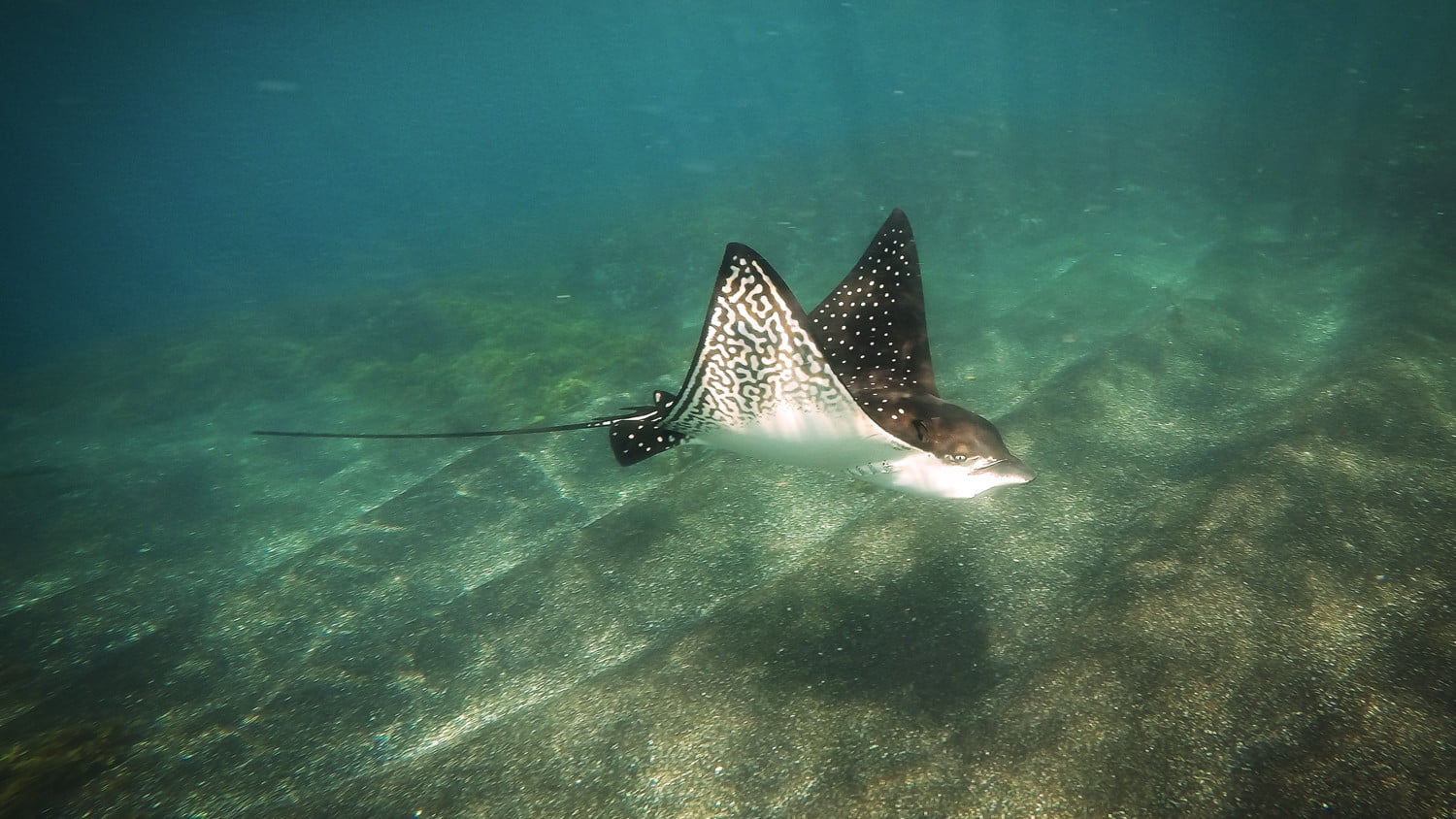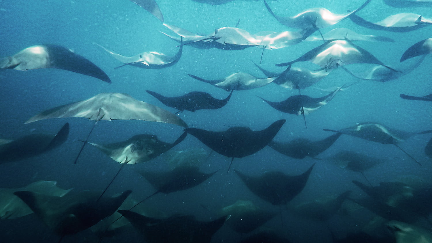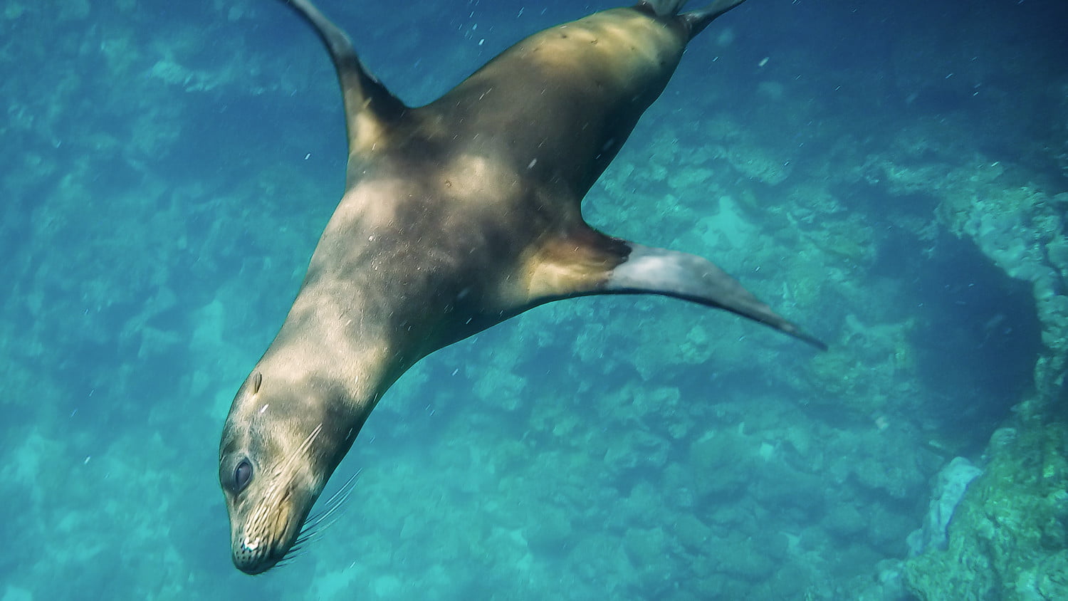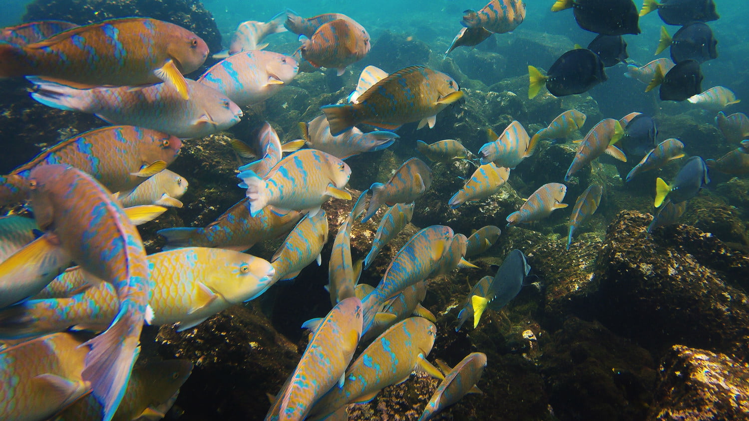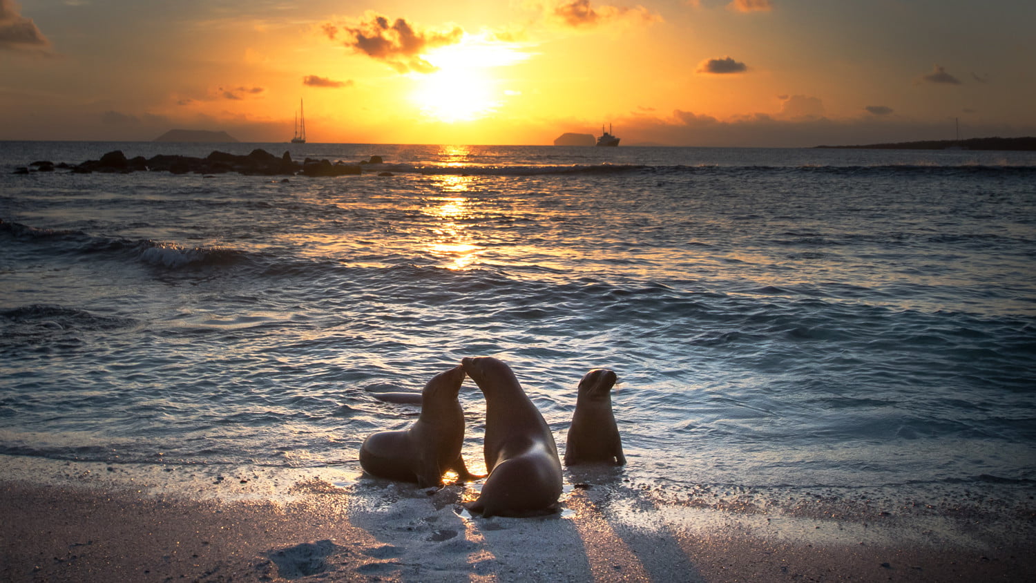 上午晚些时候,我浮潜了一会儿,与双髻鲨、两只绿海龟以及七十只以上的金色黄貂鱼(每只都有一辆菲亚特那么大)进行了接触,我出现在进化号的船尾。在那里,工作人员用水管冲洗我,拿走我的装备。船长热情地和我握手致意,我走向这艘改装得很好的日本渔船的船头,探险酒保格雷戈里递给我一杯厄瓜多尔比尔森啤酒,我和同伴们一起泡进了一个温暖的浴缸。我们被高高的悬崖包围着,两侧是筑巢的海鸟和海狮。在西边,一条狭窄而难以航行的海峡通向太平洋。否则我们就孤独了。