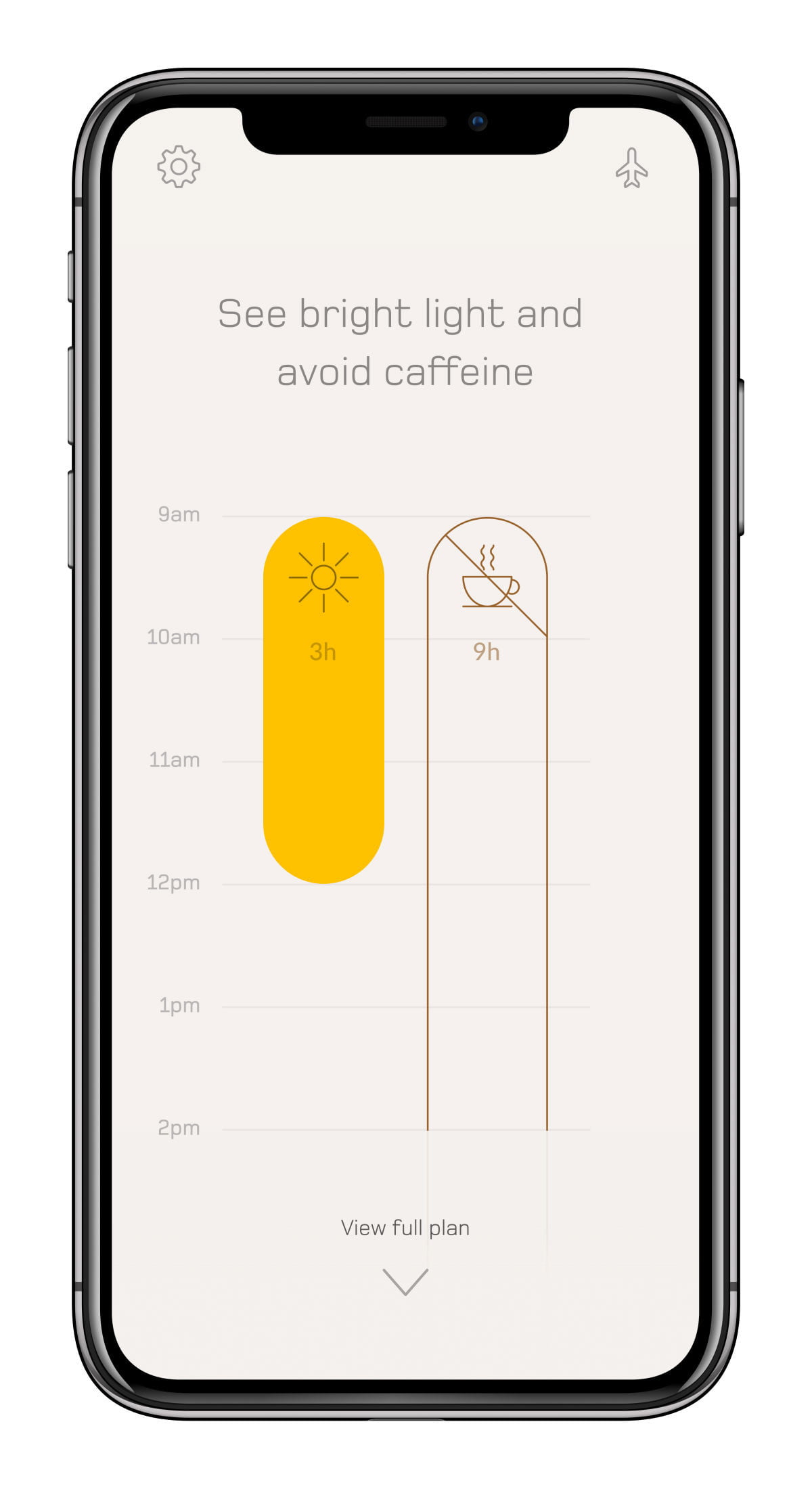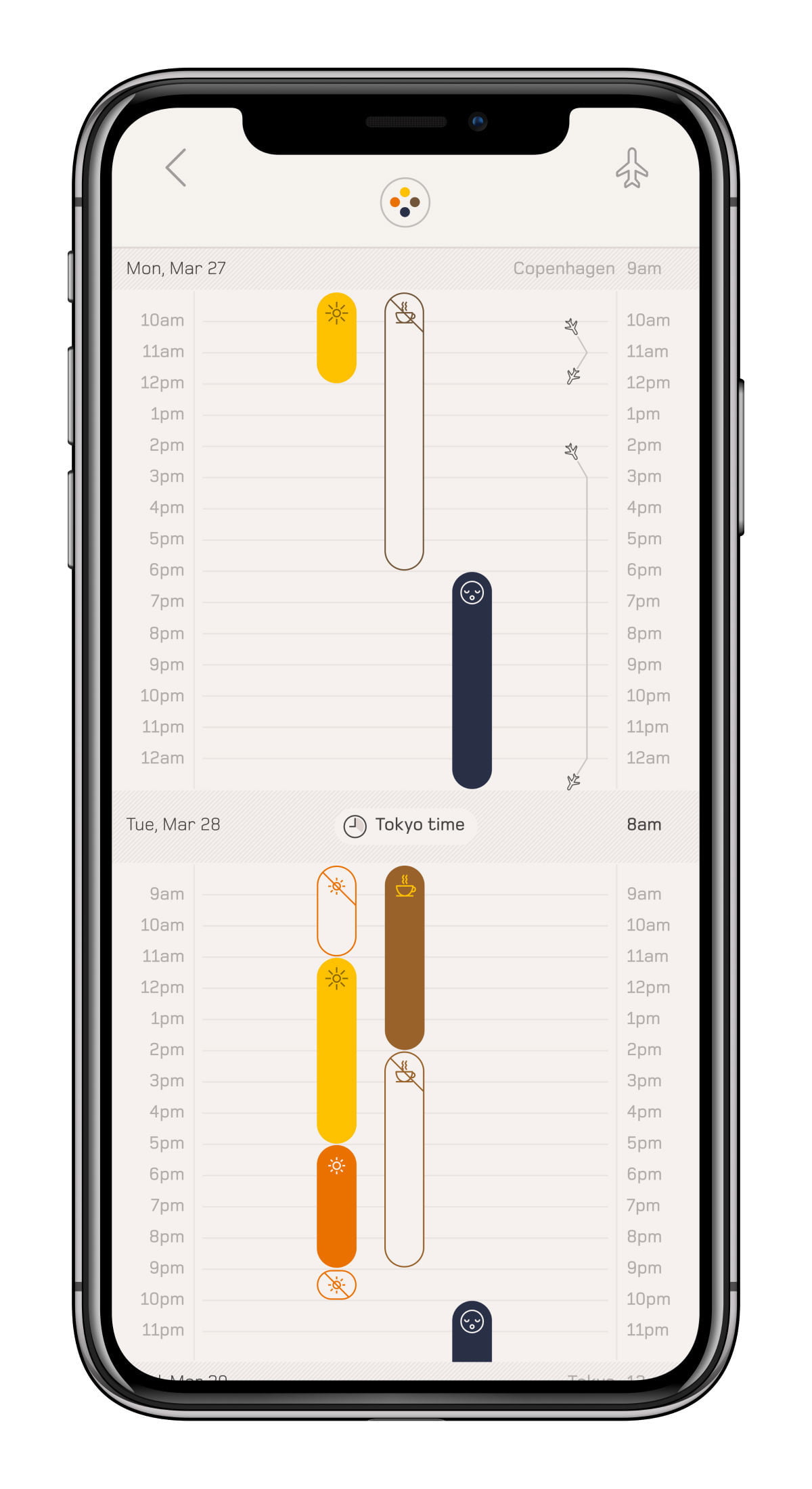 “喷气式滞后计划包括在浅黑暗的曝光时间表等特定时间采取的小行动。光线是重置昼夜节点的最重要的时间:几个小时/天,该应用程序将告诉旅行者何时避免光线,何时优先考虑明亮的光线,“Beyer-Clausen说。“动作还包括睡眠和清醒时间表和褪黑激素治疗计划(可选)。”
