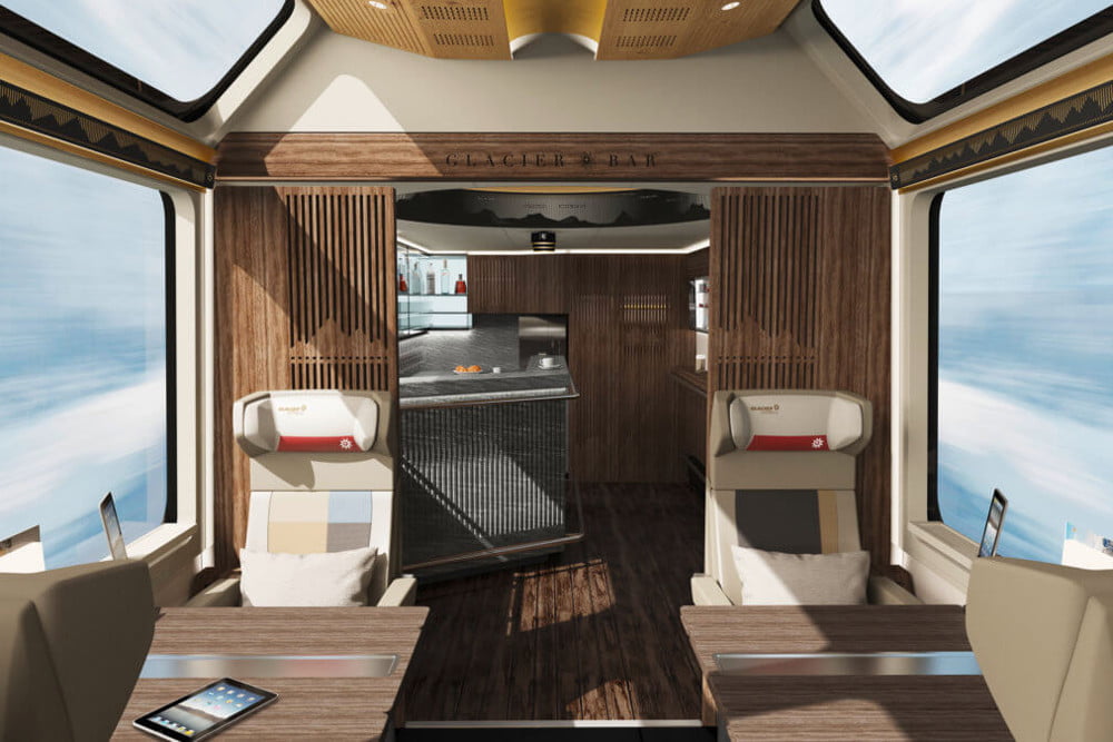 的豪华冰川快递假期将带游客在一个独一无二的旅程通过一些欧洲最令人惊叹的风景。今年,行星铁路公司将著名的铁路体验提升到一个新的,超豪华卓越级。这节专属车厢将仅能容纳20名乘客(而一般情况下是36名),专门设计的玻璃重型车厢可以提供全景视野。优秀的乘客将被提供一个私人值机柜台和欢迎鸡尾酒,整个旅程保证靠窗的座位,车厢内的酒吧,专门的礼宾服务,和五道菜的午餐,葡萄酒和下午茶。