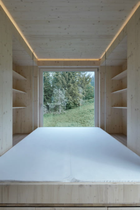 但在不断刺激的时代,你如何让游客开心?关键是每次新访客编辑机舱。这是通过滑块和大量窗户从机舱内的任何地方绘制森林的视图来完成的。面板可以打开或关闭以露出或隐藏窗户,根据访客的突发事件改变外面的视图。窗户也仔细放置了最大的影响。从玻璃墙上望着一座绿草的山丘,到睡觉阁楼上方的天窗上方,房间里的每个空间都将周围的景观变成了一件艺术。