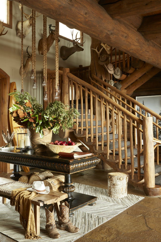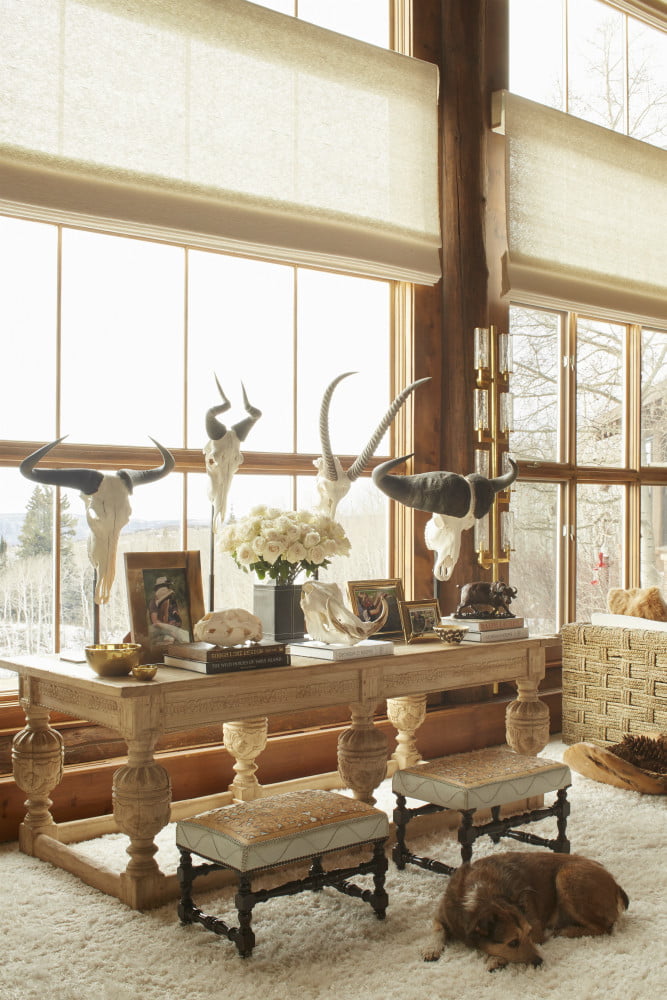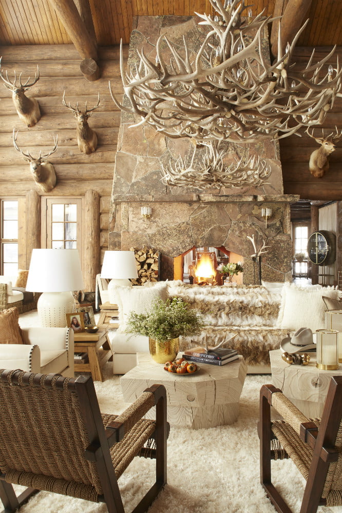 内部,主要的小屋最近由Kirsten重新设计。现在的家提供了一种更现代的山地风格。与过去典型的西部山区住宅的黑暗和布满法兰绒不同,这里的空间明亮而诱人。灵感来自大自然,恰到好处的乡村风格,装饰让你知道这是一个森林中的家。一些女性的特色,比如大房间里的白色软垫座椅和亚麻窗帘,与石头和木头形成了柔和而温暖的对比。经典的狩猎小屋细节提醒你这是麋鹿的国度,比如由鹿角制成的令人印象深刻的吊灯。