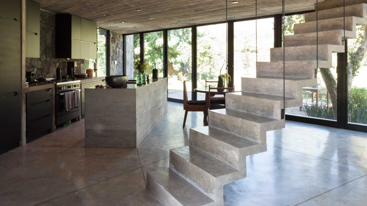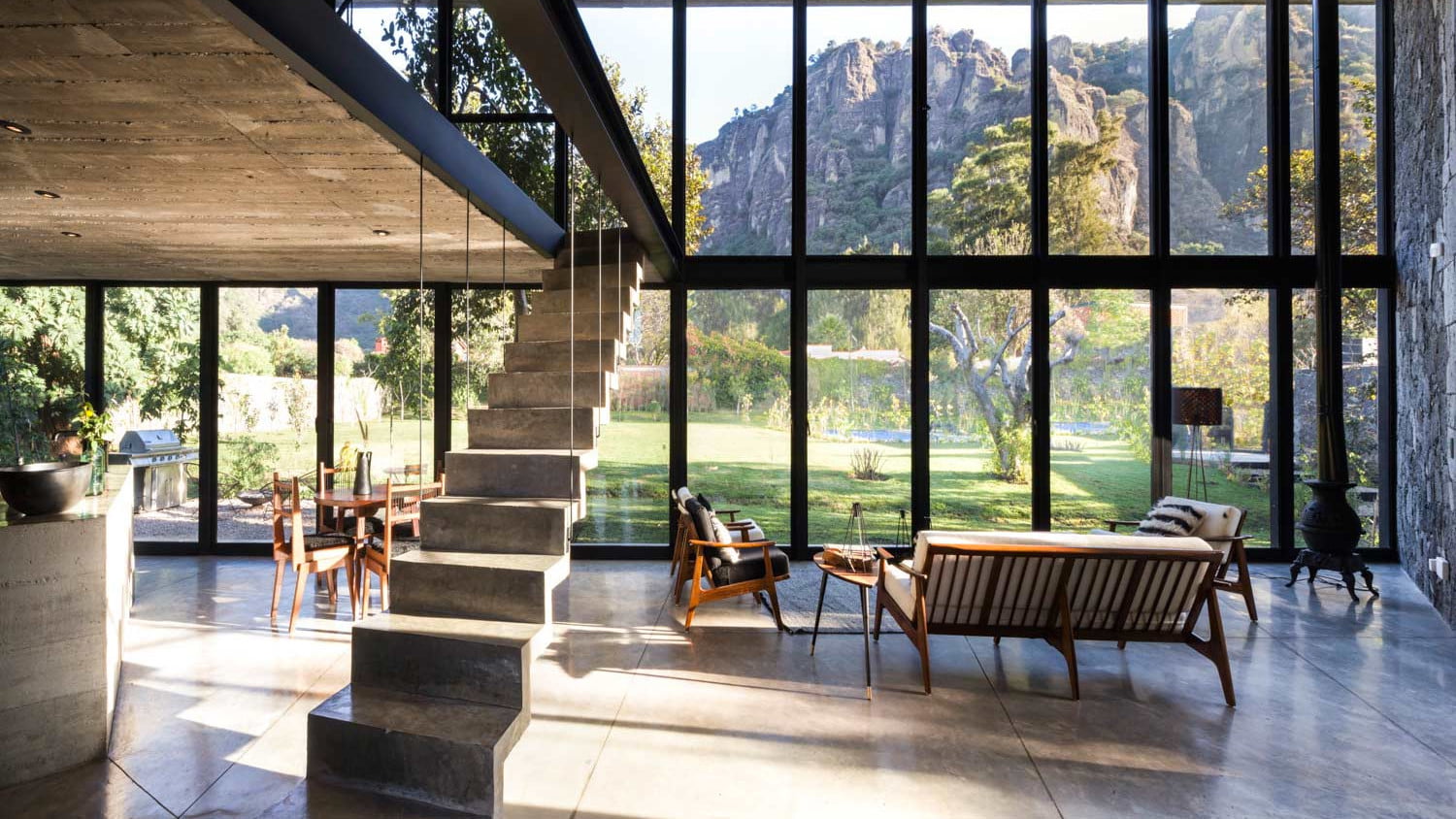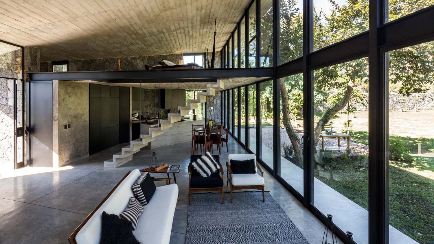 在。以南大约35英里墨西哥城, MA住宅的开放平面——包括一个浮动的石头楼梯,没有分隔楼上悬空楼层的分隔墙——与融入环境的生活结构概念相结合。
